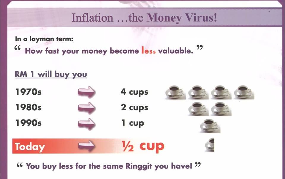 Dengan mengambil jumlah keseluruhan inflasi 10%, jika gaji sekarang adalah RM3,000, dalam masa 10 tahun anda perlu mempunyai RM7,781 untuk menyamai perbelanjaan sekarang.
